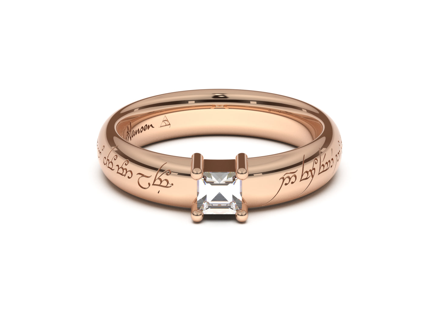 This Elvish Love Ring is a recreation of the “Movie Ring” that played the role of the “One Ring” in the “Lord of the Rings” movie trilogy by Peter Jackson.The design is based on how one of Jens’ sons, Thorkild, described the ring as a child:“Simple, heavy band.”Since the first movie premiered in December 2001, the Movie Ring has been the most recognizable ring in the world.
