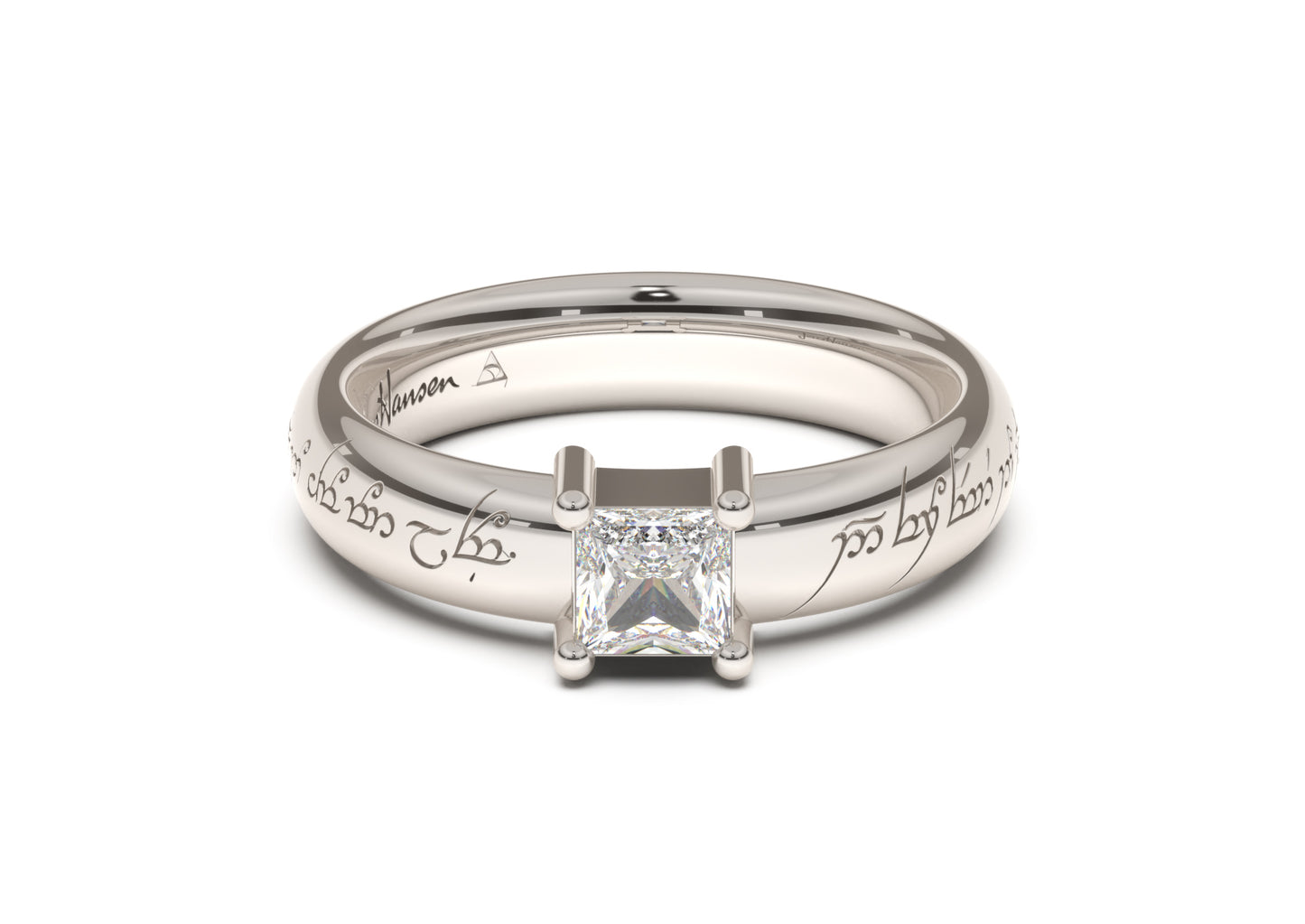 This Elvish Love Ring is a recreation of the “Movie Ring” that played the role of the “One Ring” in the “Lord of the Rings” movie trilogy by Peter Jackson.The design is based on how one of Jens’ sons, Thorkild, described the ring as a child:“Simple, heavy band.”Since the first movie premiered in December 2001, the Movie Ring has been the most recognizable ring in the world.