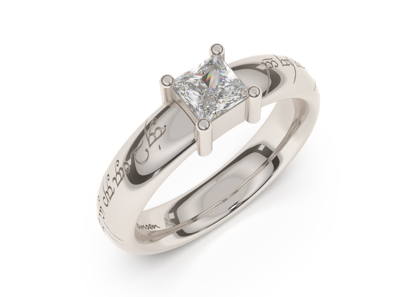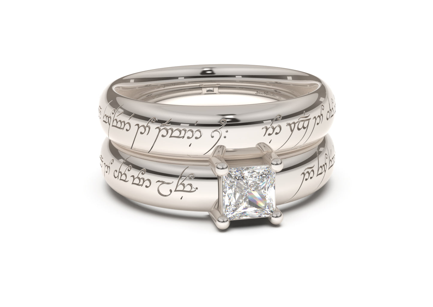 The engraving is often what truly gives a ring its meaning. You can choose your own Elvish (or any other language) engraving for both inside and outside the ring.The Elvish Love Poem fits perfectly on the outside of the ring:One ring to show our love,One ring to bind us,One ring to seal our love,And forever to entwine us.