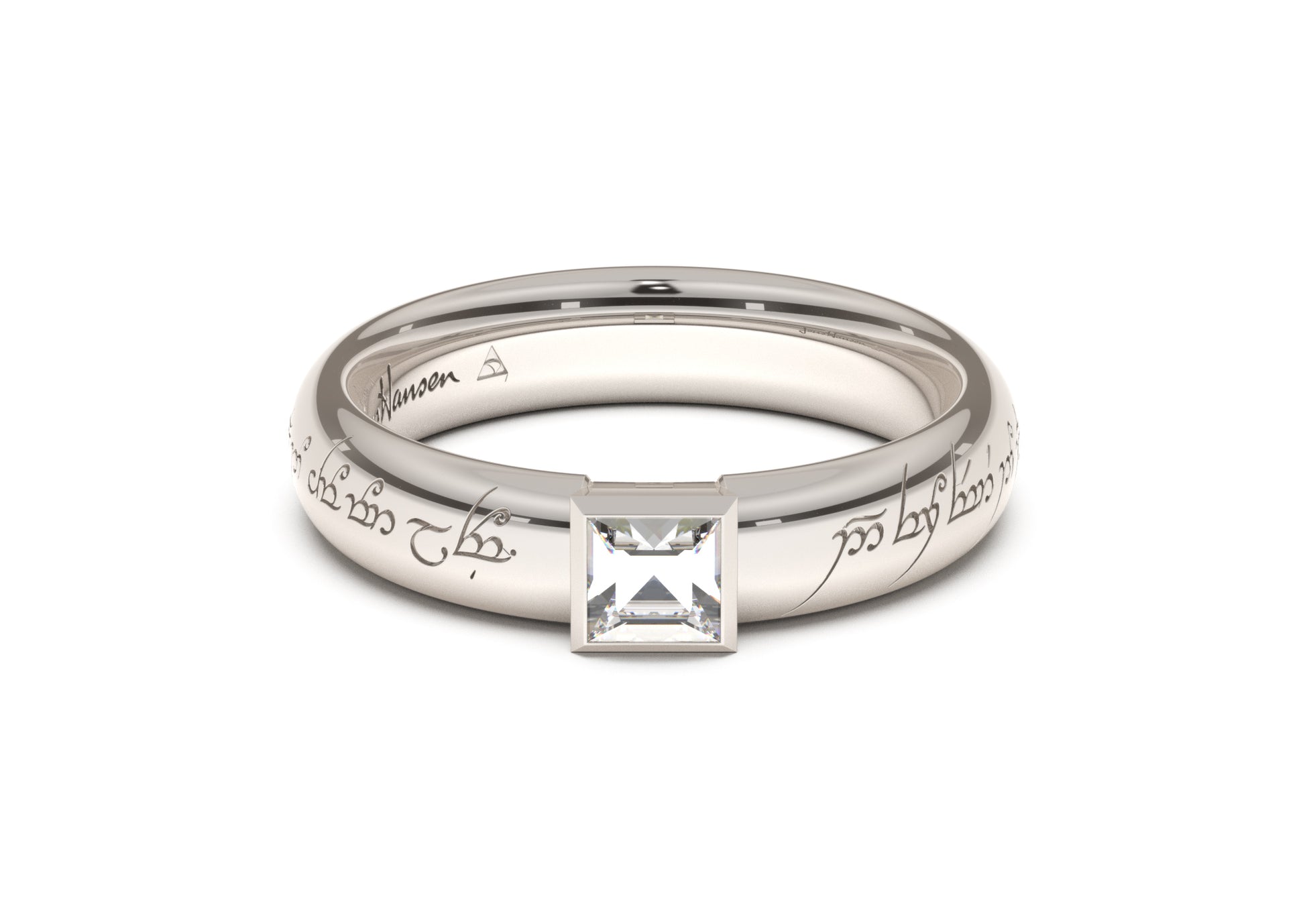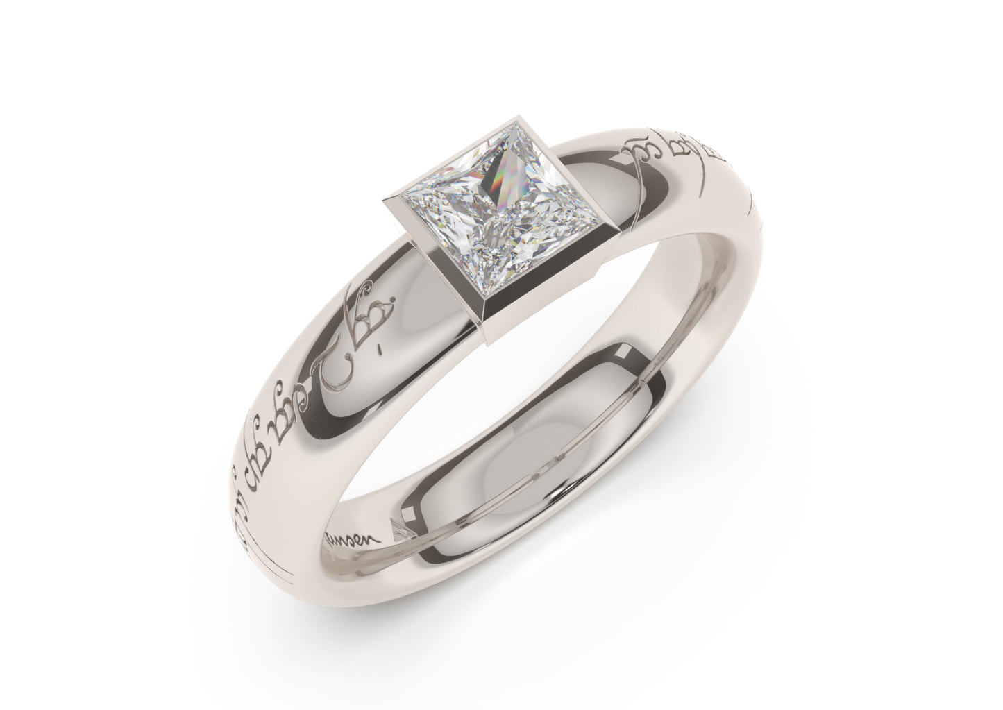 The engraving is often what truly gives a ring its meaning. You can choose your own Elvish (or any other language) engraving for both inside and outside the ring.The Elvish Love Poem fits perfectly on the outside of the ring:One ring to show our love,One ring to bind us,One ring to seal our love,And forever to entwine us.