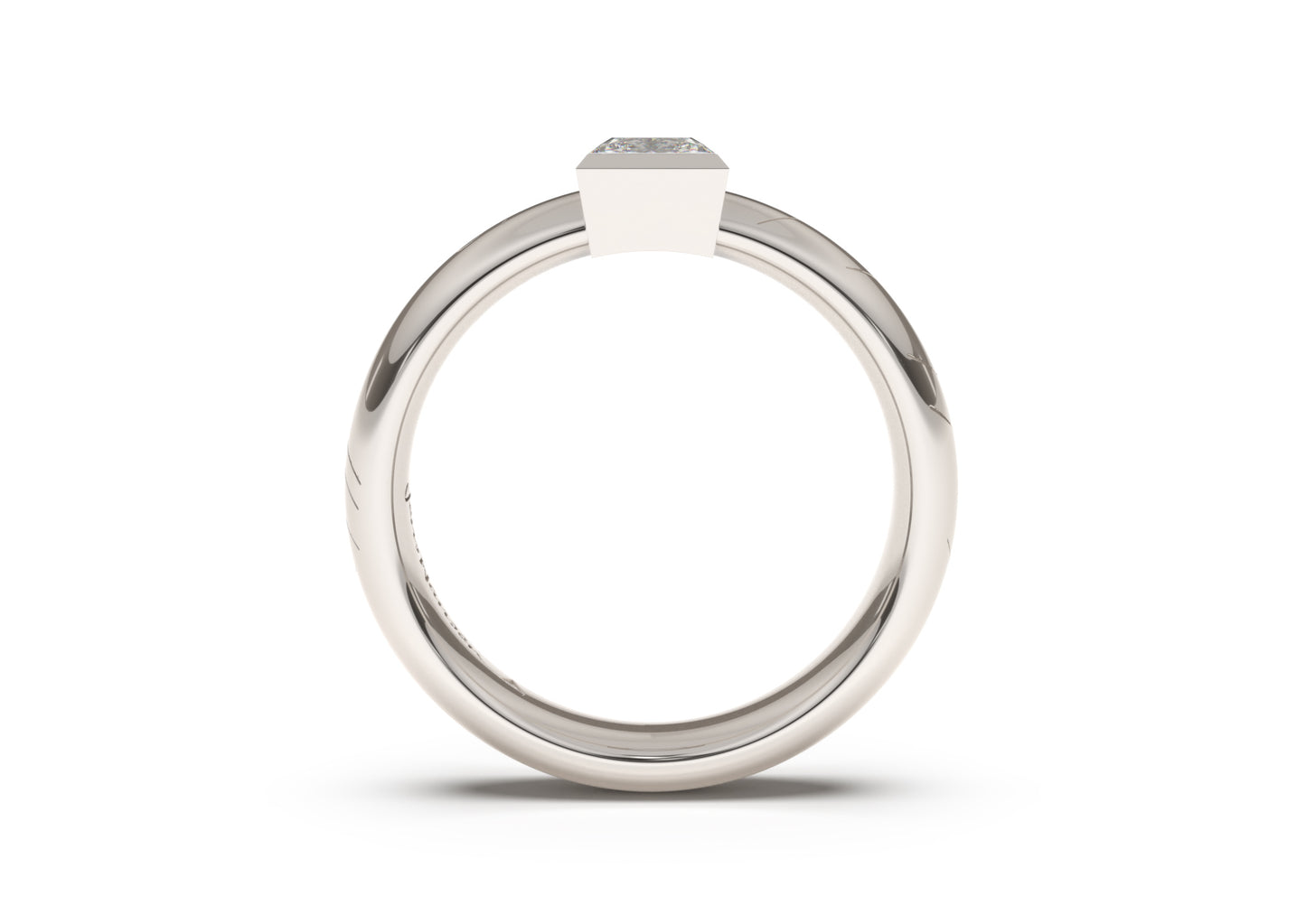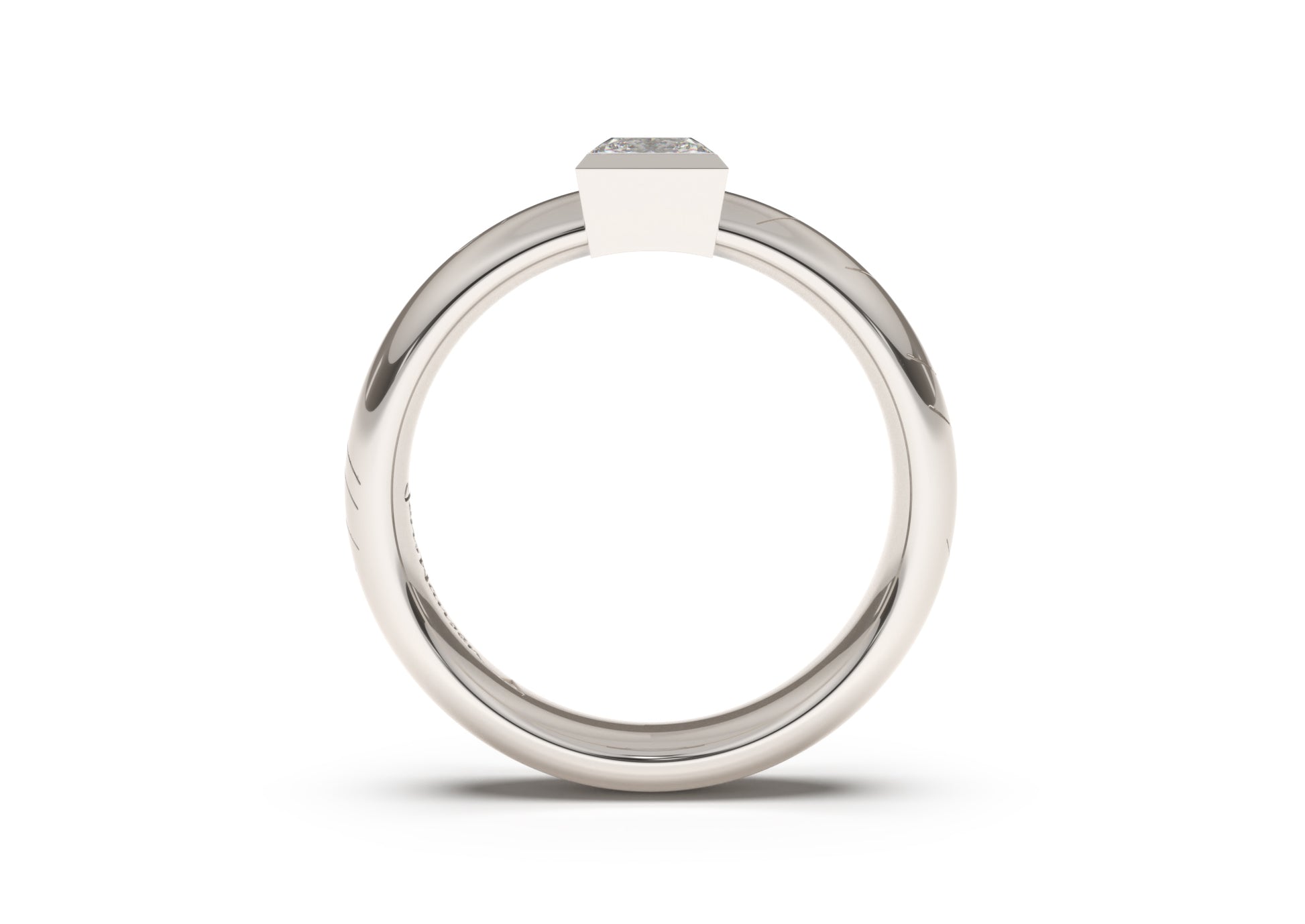 Elegant contemporary styling, fashioned in white gold or platinum, this ring features a tapered bezel setting that showcases the brilliance of the princess cut diamond.