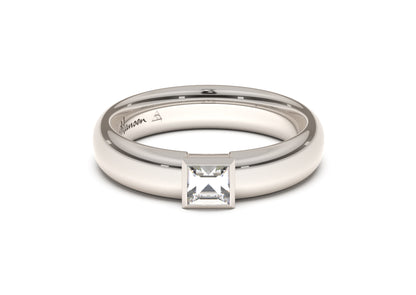 Elegant contemporary styling, fashioned in white gold or platinum, this ring features a tapered bezel setting that showcases the brilliance of the princess cut diamond.