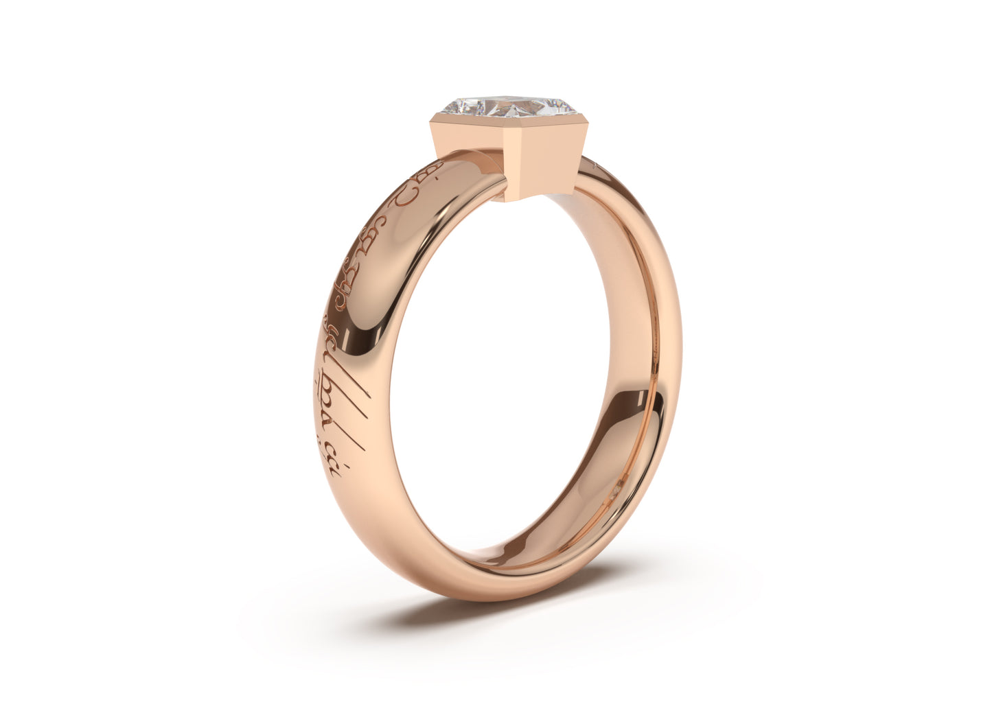 The engraving is often what truly gives a ring its meaning. You can choose your own Elvish (or any other language) engraving for both inside and outside the ring.The Elvish Love Poem fits perfectly on the outside of the ring:One ring to show our love,One ring to bind us,One ring to seal our love,And forever to entwine us.