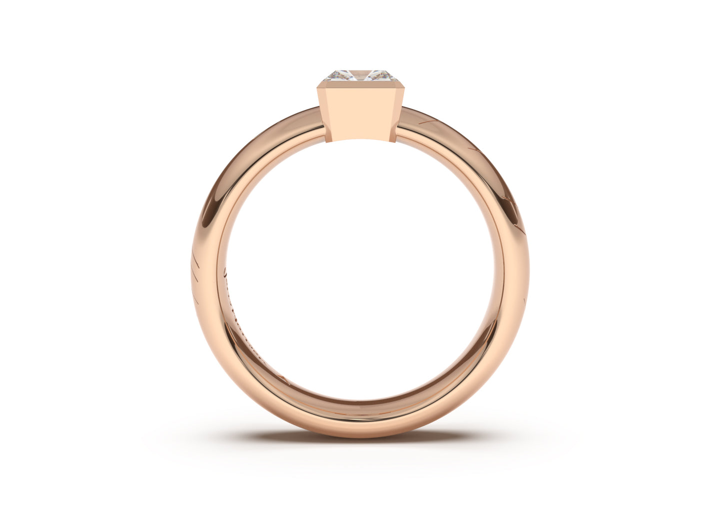 Elegant contemporary styling, fashioned in red gold, this ring features a tapered bezel setting that showcases the brilliance of the rectangular diamond.