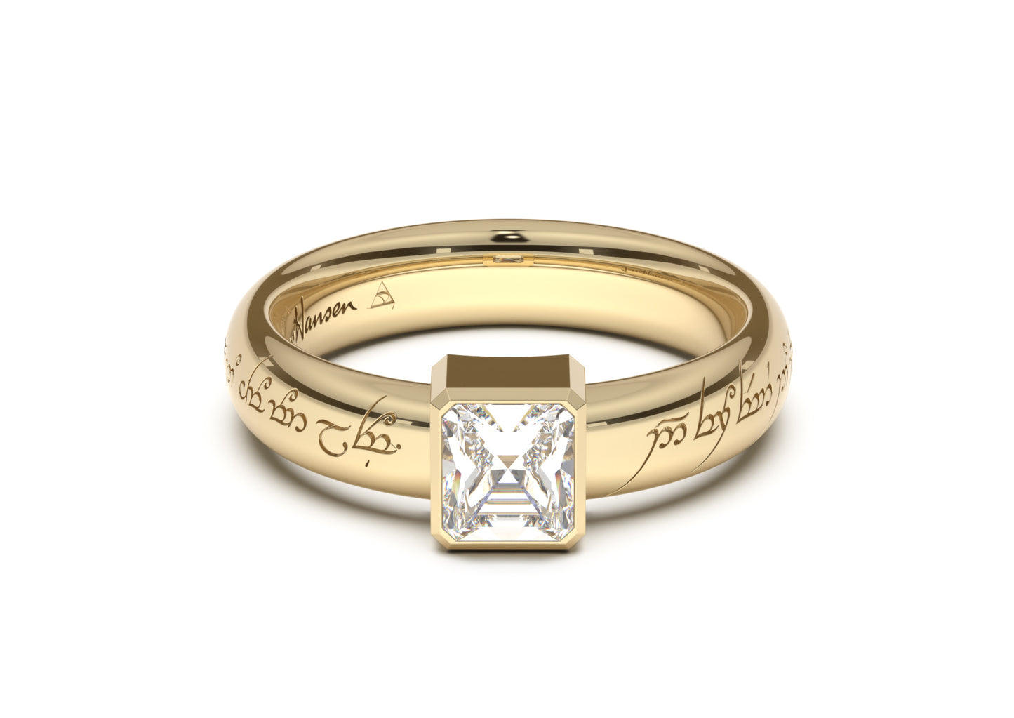 This Elvish Love Ring is a recreation of the “Movie Ring” that played the role of the “One Ring” in the “Lord of the Rings” movie trilogy by Peter Jackson.The design is based on how one of Jens’ sons, Thorkild, described the ring as a child:“Simple, heavy band.”Since the first movie premiered in December 2001, the Movie Ring has been the most recognizable ring in the world.