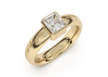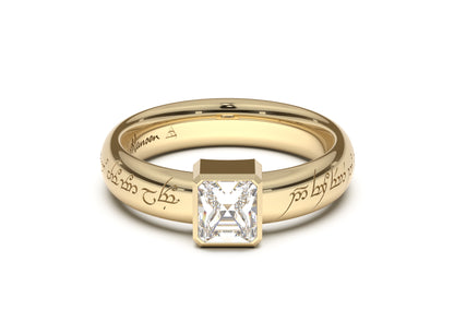 The engraving is often what truly gives a ring its meaning. You can choose your own Elvish (or any other language) engraving for both inside and outside the ring.The Elvish Love Poem fits perfectly on the outside of the ring:One ring to show our love,One ring to bind us,One ring to seal our love,And forever to entwine us.