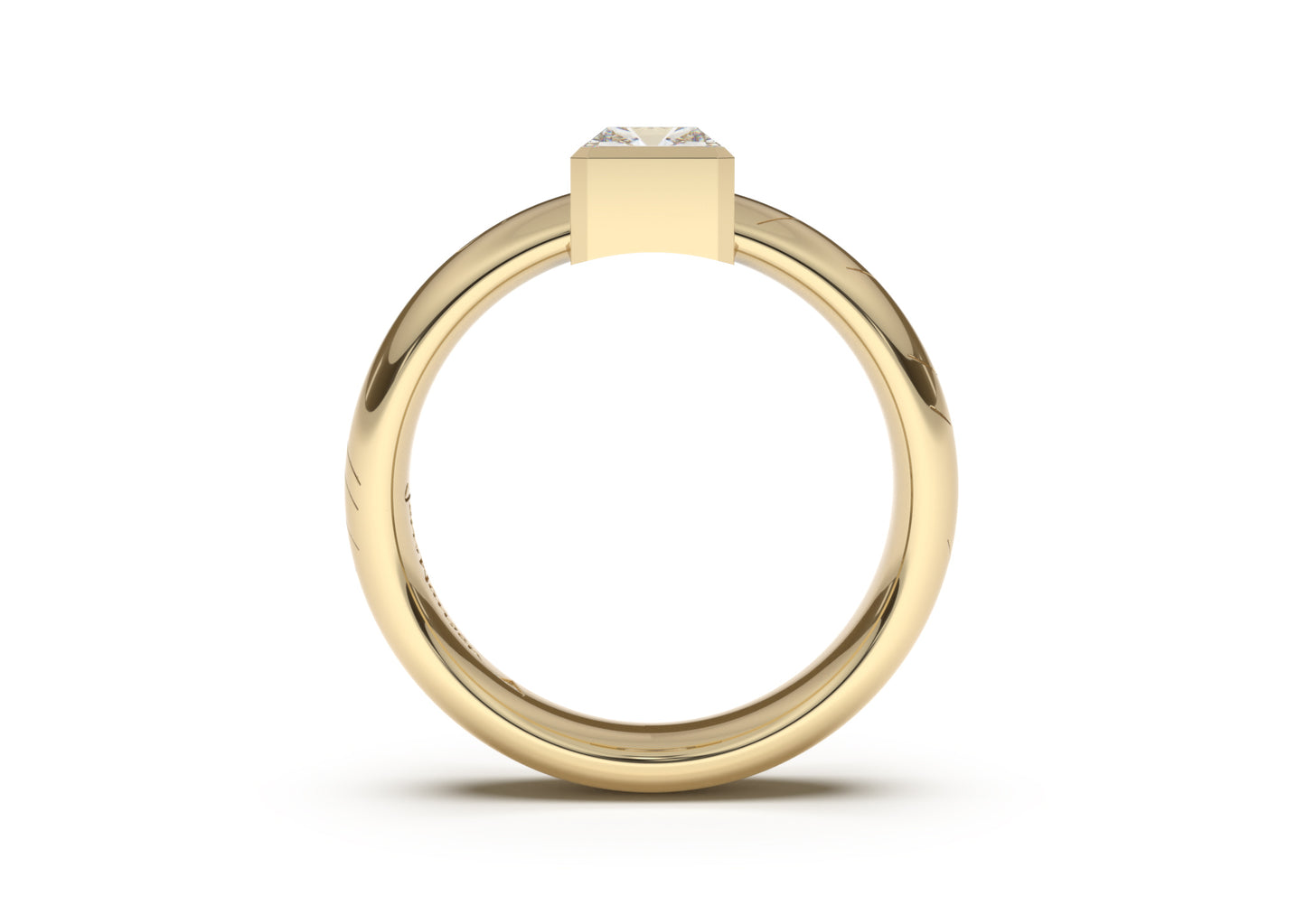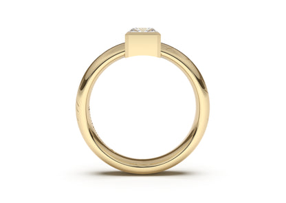Stunning modern styling, fashioned in yellow gold, this ring features a straight bezel setting that showcases the brilliance of the rectangular diamond.