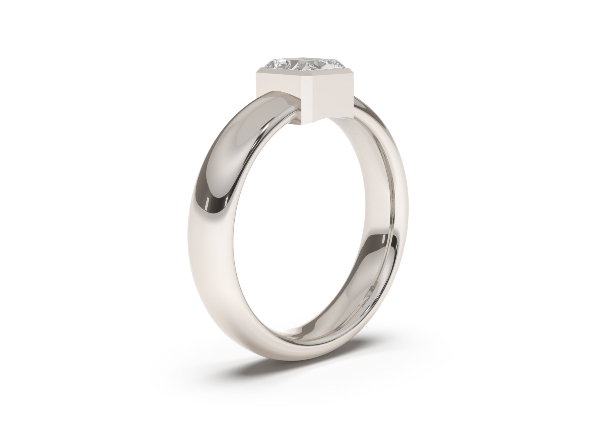 Stunning modern styling, fashioned in white gold or platinum, this ring features a straight bezel setting that showcases the brilliance of the rectangular diamond.