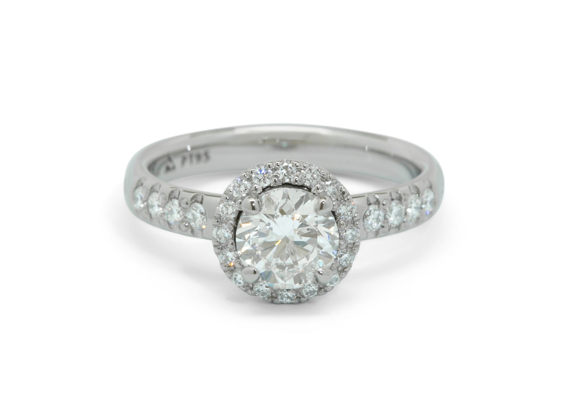 Diamond engagement ring centrally set with an impressive one carat diamond, a halo of sixteen shimmering diamonds and eight more on the band.