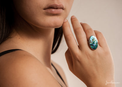 Paua is an organic gem, each ring will be unique the colours and patterns may vary.