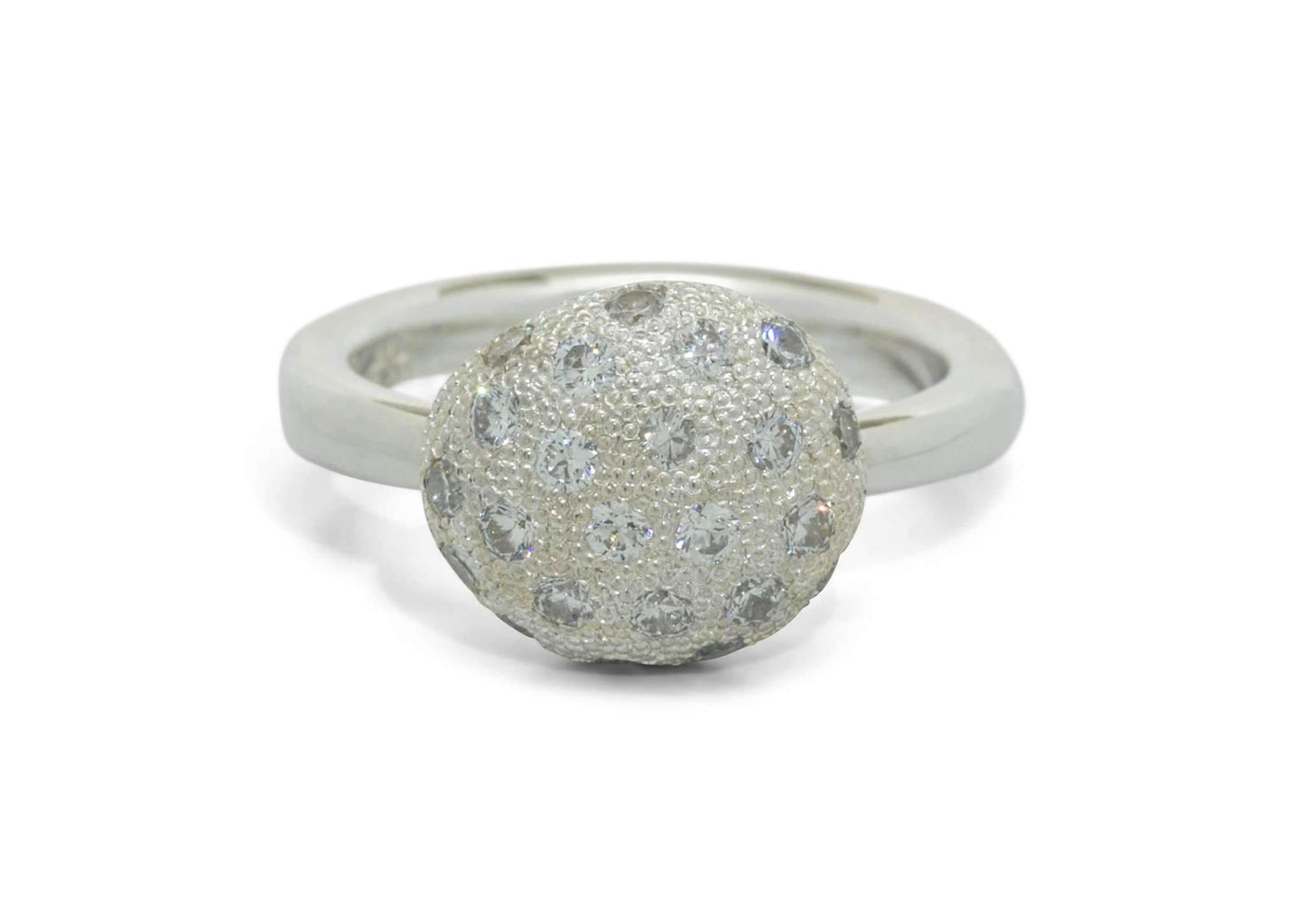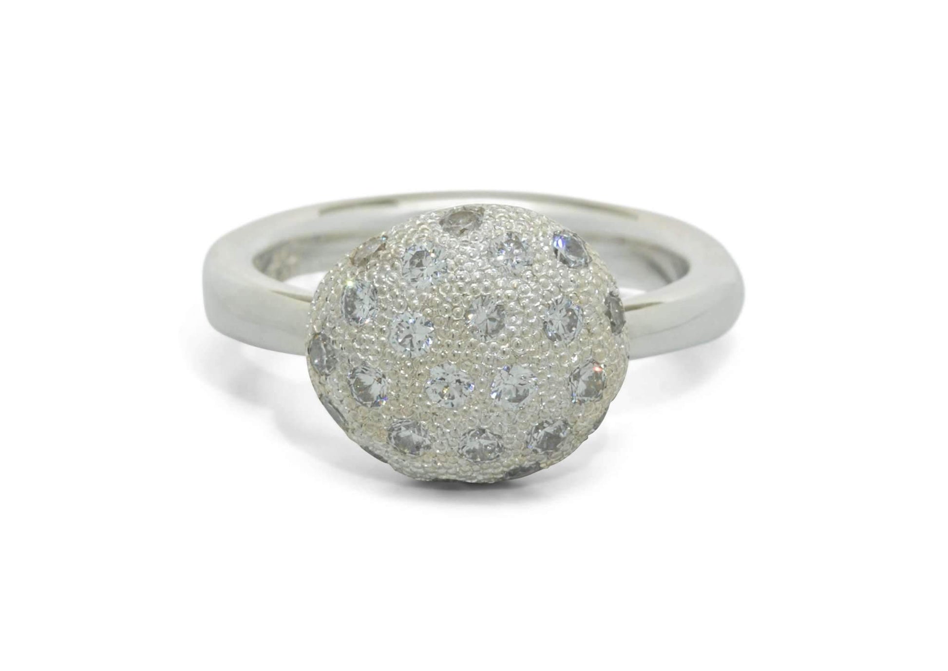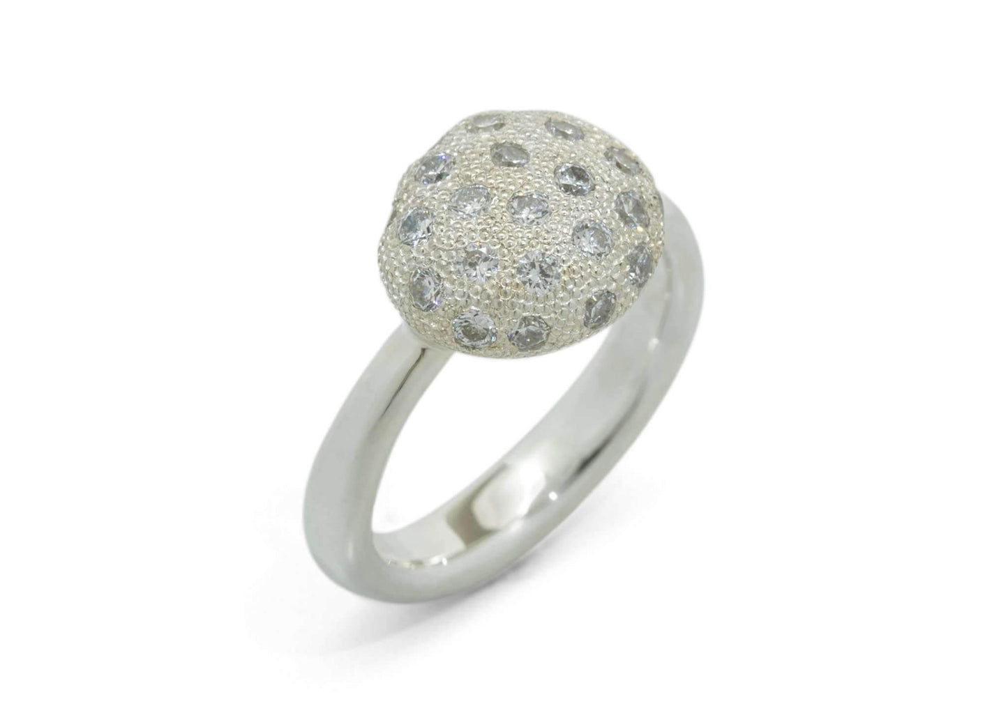 Twenty-two glimmering round cut diamonds turn this organic button ring into a brilliant display of fire. The white gold band is polished to a high shine, matching the brilliance of the diamond pave that adorns this button design. This Jens Hansen original matches stunning diamond pave with playful contemporary design for an unforgettable ring.
