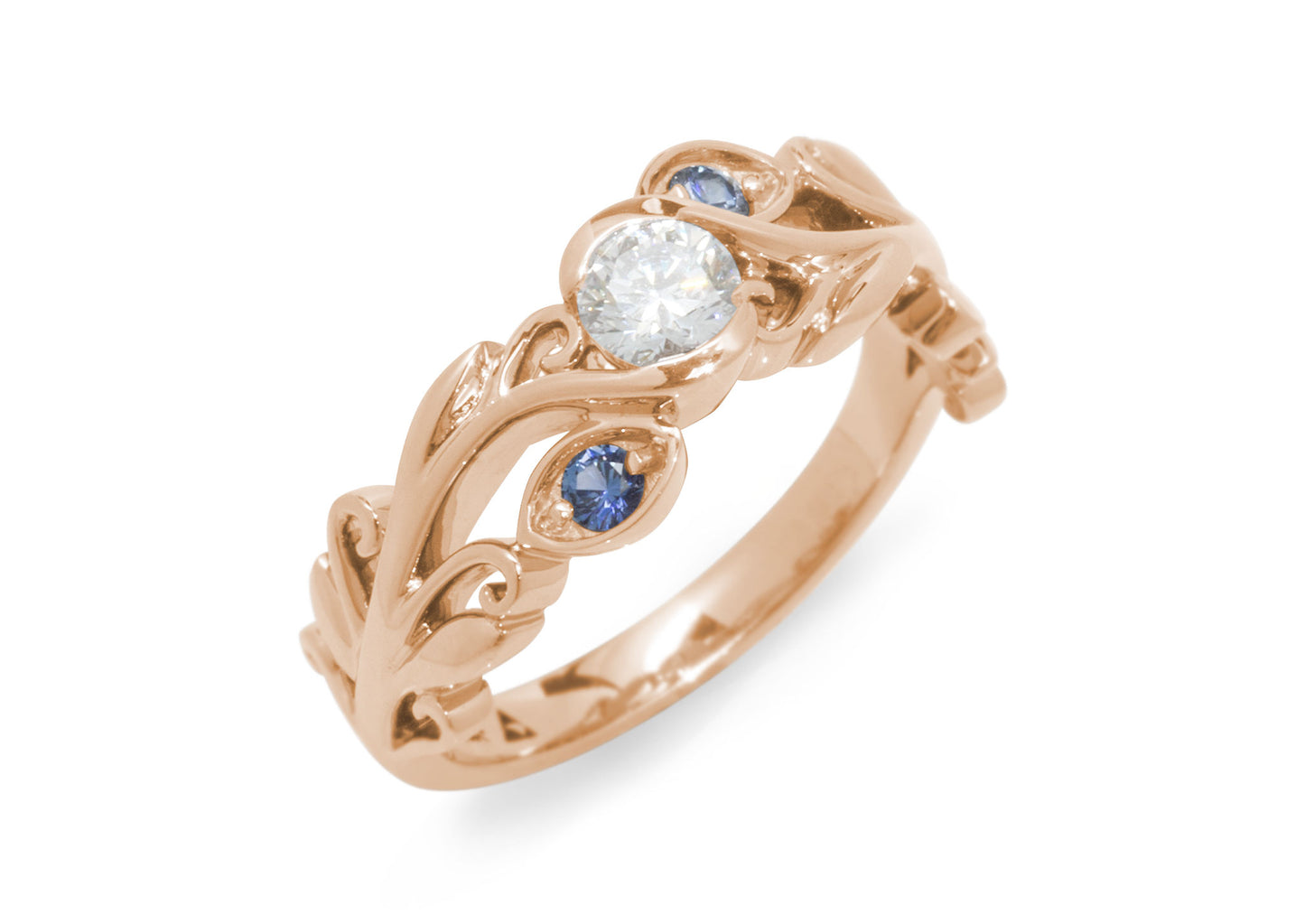 Three-Stone Diamond & Sapphire Elvish Vine Engagement Ring, Red Gold