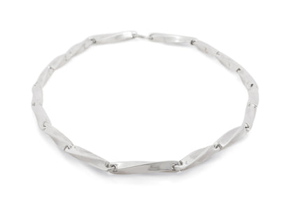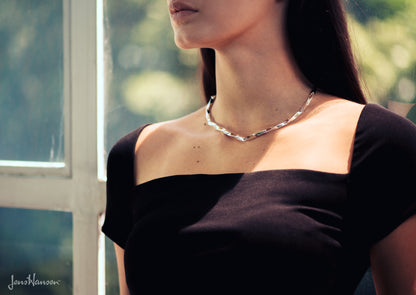 The twisted version of our classic block chain necklace. This sterling silver hand crafted necklace is a testimony to timeless artisan beauty and elegance. Whether you want something chic for a party, or for every day wear, this necklace is a lovely addition to your jewellery collection.