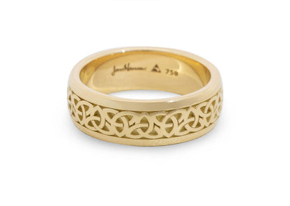 The triquetra, also known as a "trinity knot," is believed to represent the three promises of a relationship such as to love, honour and protect. Our design references this with the use of a strong yellow gold comfort fit band and Trinity symbol inlay.