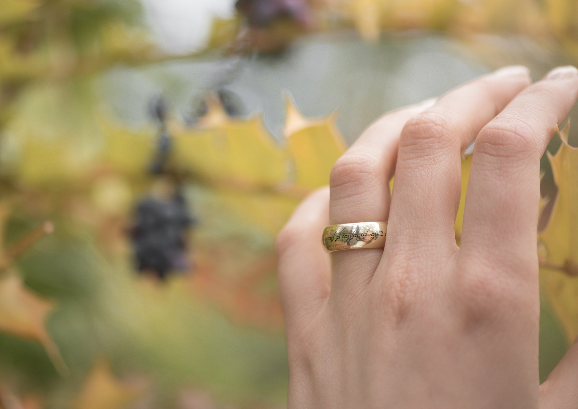 This Elvish Love Ring is a recreation of the “Movie Ring” that played the role of the “One Ring” in the “Lord of the Rings” movie trilogy by Peter Jackson.The design is based on how one of Jens’ sons, Thorkild, described the ring as a child:“Simple, heavy band.”Since the first movie premiered in December 2001, the Movie Ring has been the most recognizable ring in the world.